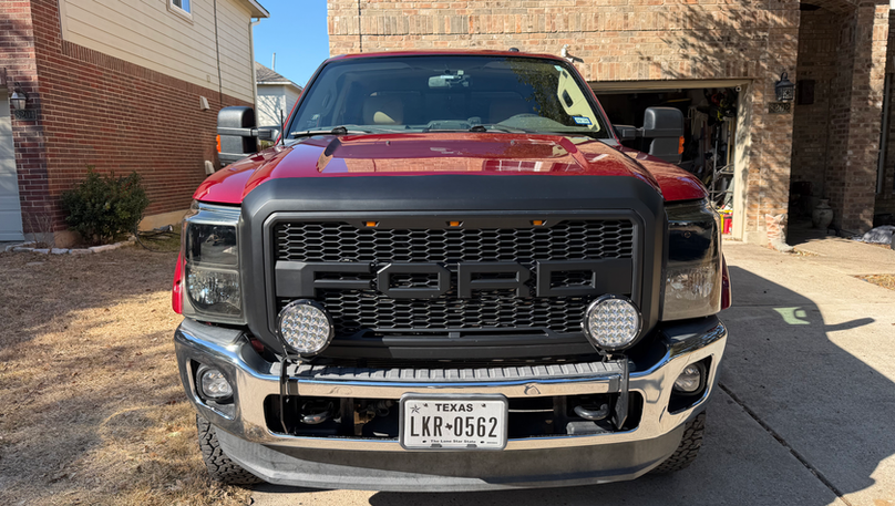 The Ruby Red Metallic F-350 Lariat is powered by a 6.7 turbo diesel with six speed automatic transmission. It has heated/cooled leather seats, upgraded Sync 3 audio/navigation system, and 2-inch lift. Truck features good rubber, tonneau cover, chrome nerf bars, blackout front grille and LED lighting.